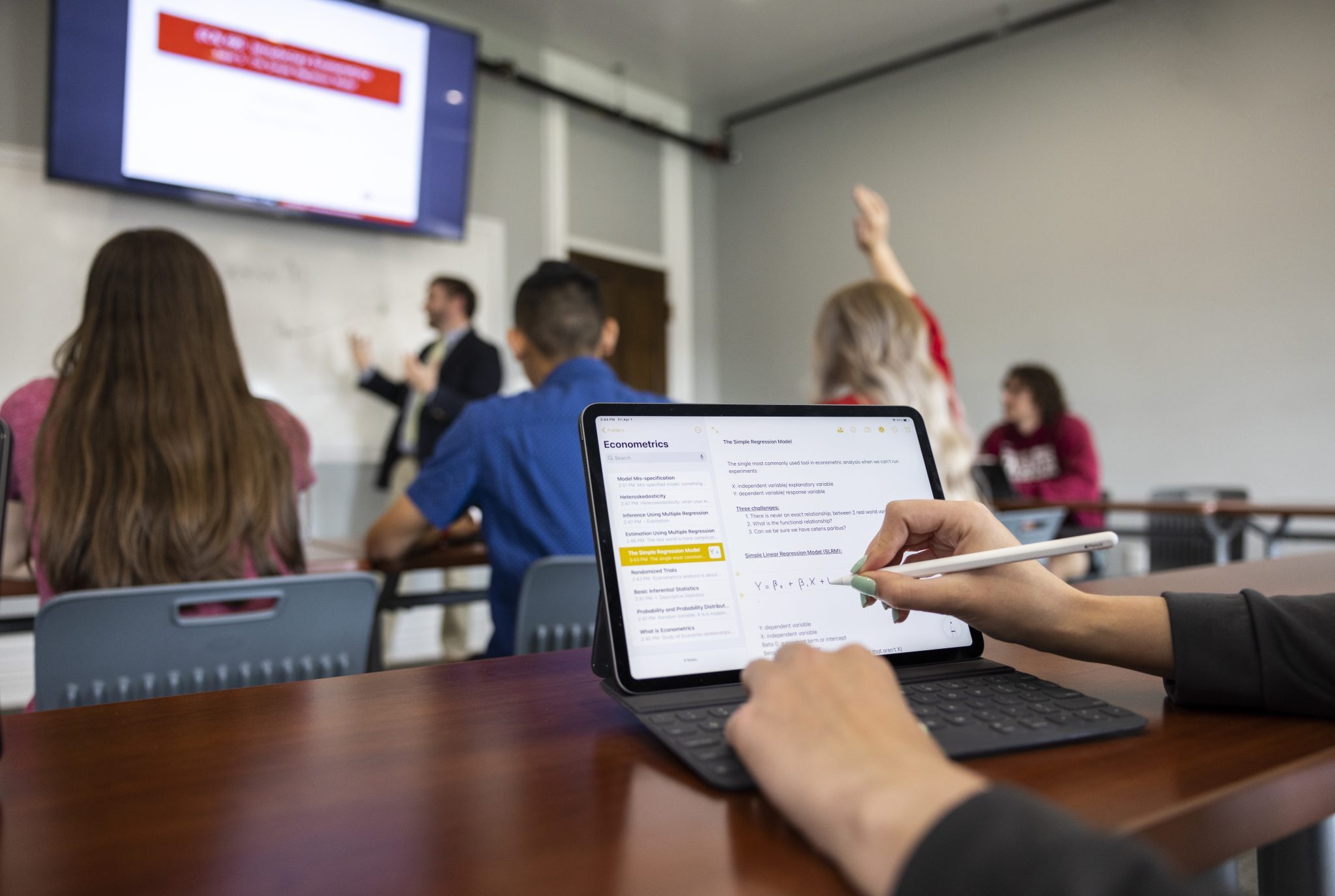 As a learning tool, each faculty member has implemented the technology according to their fields of study and teaching styles to enhance the student experience. For example, Professor of Math Doug Cheney uses his iPad as a virtual chalkboard to work on math problems with his students in real time. His students also use the note-taking app Notability to handwrite their solutions to exercises and use its recording feature to play back audio of the class discussion timed with their drawn or typed notes.